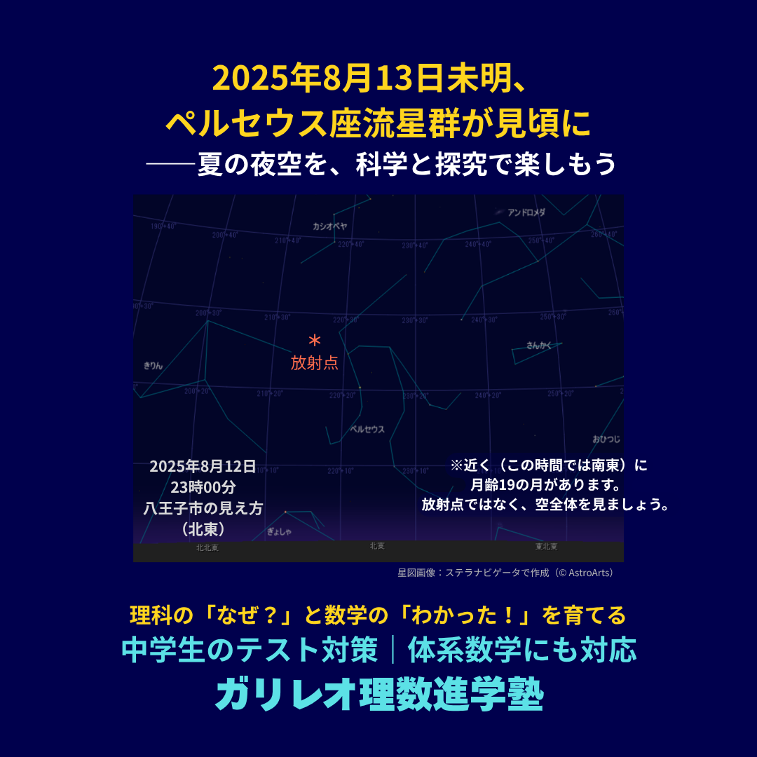 2025年夏の風物詩、ペルセウス座流星群の様子(八王子市での見え方を例に)。