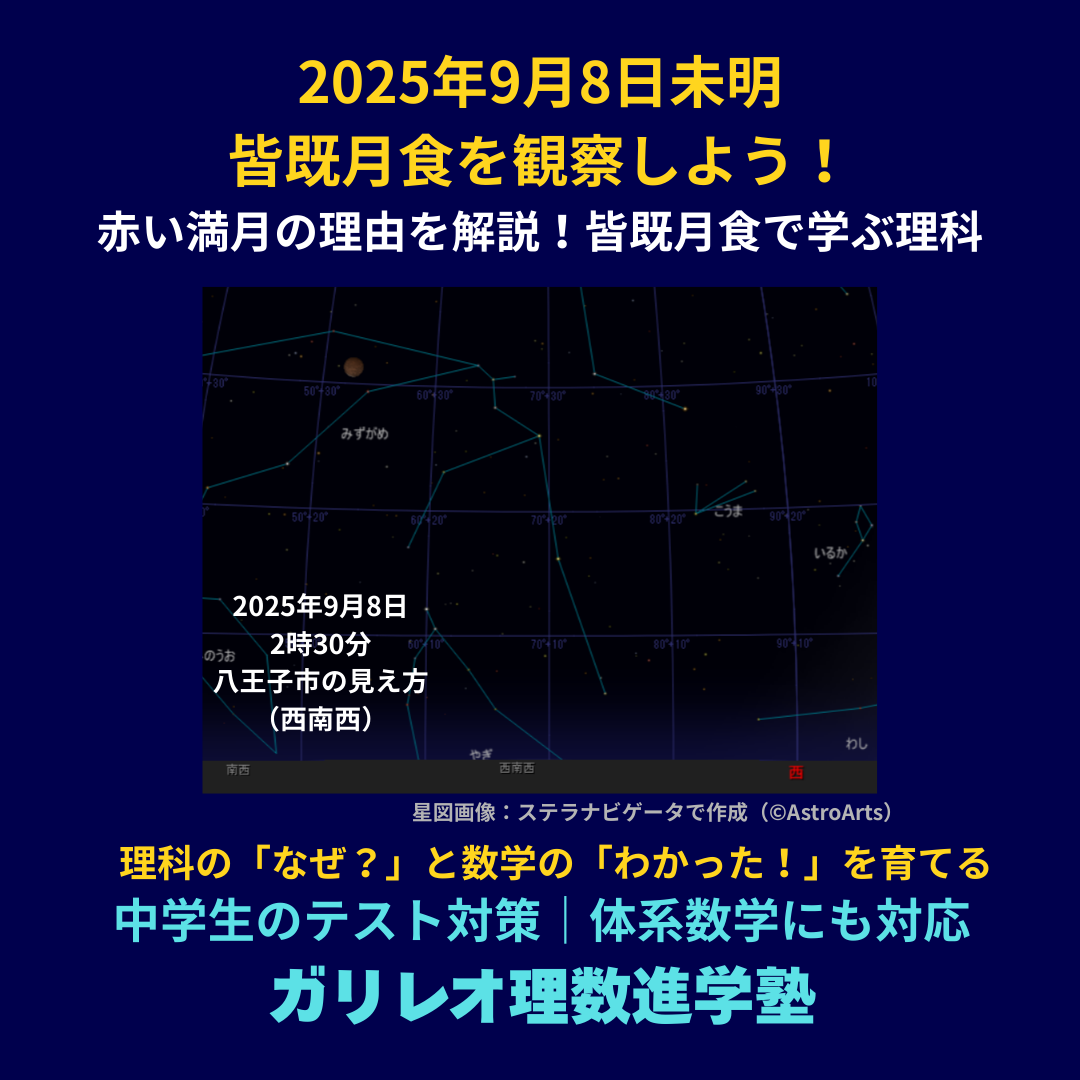 2025年9月8日午前2時30分頃の皆既月食(八王子市からの見え方、西南西方向)。星図はステラナビゲーターで作成(© AstroArts)。